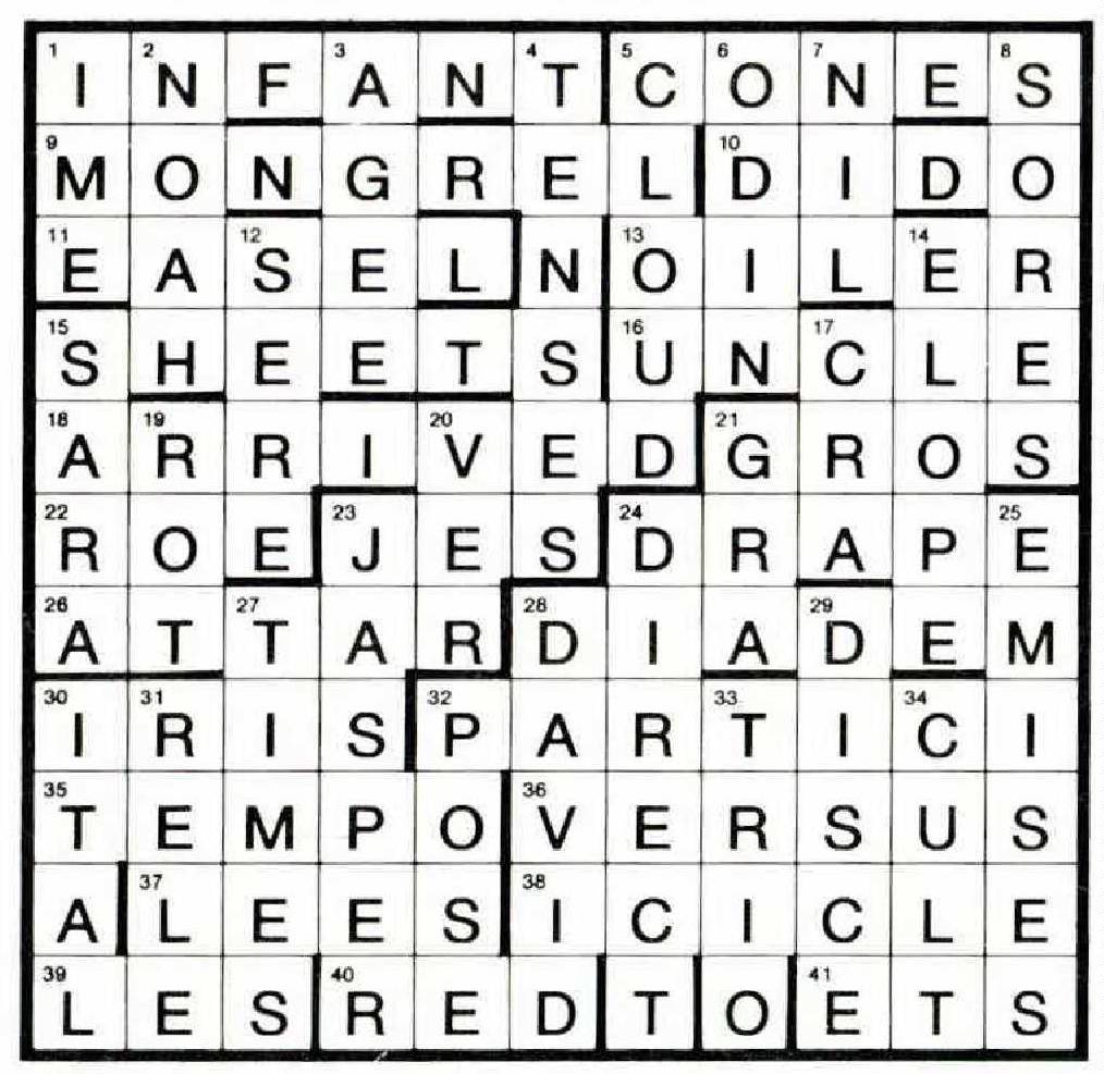 Across. 1. IN-F-ANT (tan anag.) *5. CONEStoga (anag.) 9. MONGREL (anag. + m) 10. DID-O 11. (W)EASEL 13. OILER (hidden rev.) 15. SHE-ETS (set anag.) *16.f-“(rUN)CLE (clue anag.) 18. ARRIVED (anag. + a) 21. GROS(s) 22. ROE (homophone) *23. JEsuitS (suite anag. in JS) 24. D-RAPE 26. (f)AT-TAR 28. DIADEM (hidden) 30. IRIS (pun) *32. PARTICIpants (anag.) 35. TEMPO (anag. + t) 36. VERSUS (hidden) 37. LEES (anag.) 38. IC-ICLE (lice anag.) *39. BibLES (anag. without n) *40. hatRED (anag.) *41. sockETS (“change” p to s) Down. *1. double tIME (anag.) *2. NOAH’S ark (anag.) 3. AGEE (the “first” and “last” of aiming) 4. TENSES (anag. + t) 5. C-LOUD 6. ODIN (hidden) 7. NIL (first letters) 8. SORES (homophone of soars) 12. S-ERE 14. (pen)ELOPE *15. s(ARAb)and *17. CRAb louse (anag.) 19. ROT (rev. of tor) *20. b-raVER *21. GRAves-t 23. JA-SP-ER 24. DIRECT (double def.) *25. EMISsariES (anag.) 27. TIMES (anag.) 28. D-AVID *29. DISturbanCE (anag.) *30. cap-ITAL (tail anag.) *31. REveilLE (anag.) 32. POS(tag)E 33. TRIO (hidden) 34. CU(L)T