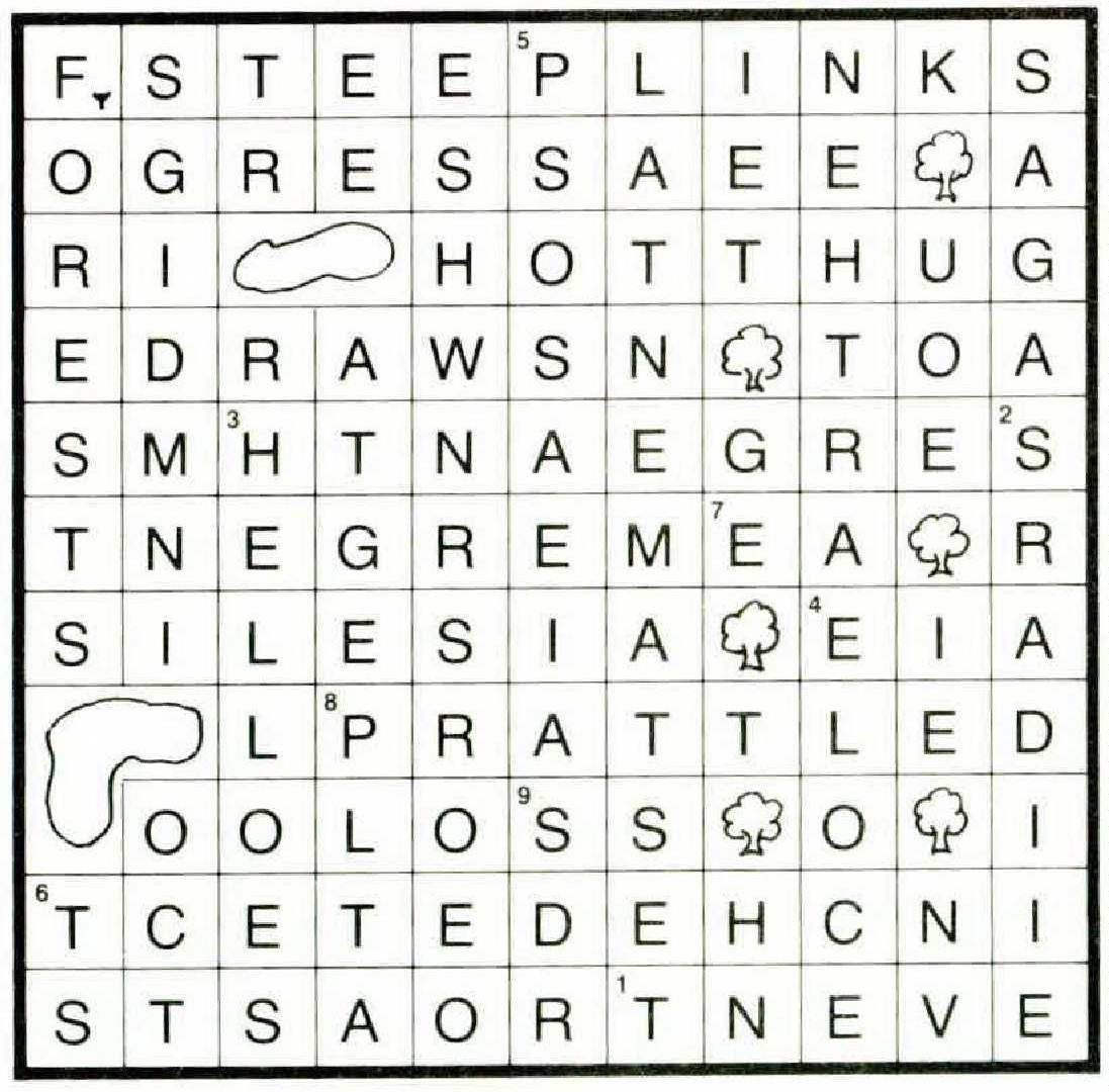 l.a. FORE(ST)S b. SILESIA (anag.) c. A-TONE d. EVEN-T 2.a. TES(T[AM]ENT)AL (tales anag.) b. LINKS (double def.) c. SAG-A’S 3.a. SERGE-ANT b. T(O)-RIO c. (pr)OGRESS d. SH-AH 4.a. H(ELL)OES b. STOA (anag.) c. A-SHE d. ECOLE (hidden) 5.a. EAR(THE)N b. NETS (double def.) c. SWARD (rev.) d. DIGS (double def.) e. STEEP (double def.) 6.a. PATTER (pun) b. RADI-I (anag. + i) c. (P)INCHED d. D(ETE)C-T (tee anag.) 7.a. TO-LE(RAN)T b. T(H)UG C. GO-RE 8.a. EMERGENT (anag.) b. TILLER (double def.) c. ROASTS (anag.) d. SCOP (anag.) 9.a. P(RATTLE)D b. D(IAGN)OSE (gain anag.) c. ERIE (hidden) d. EME([h]ER)S (seem anag.)