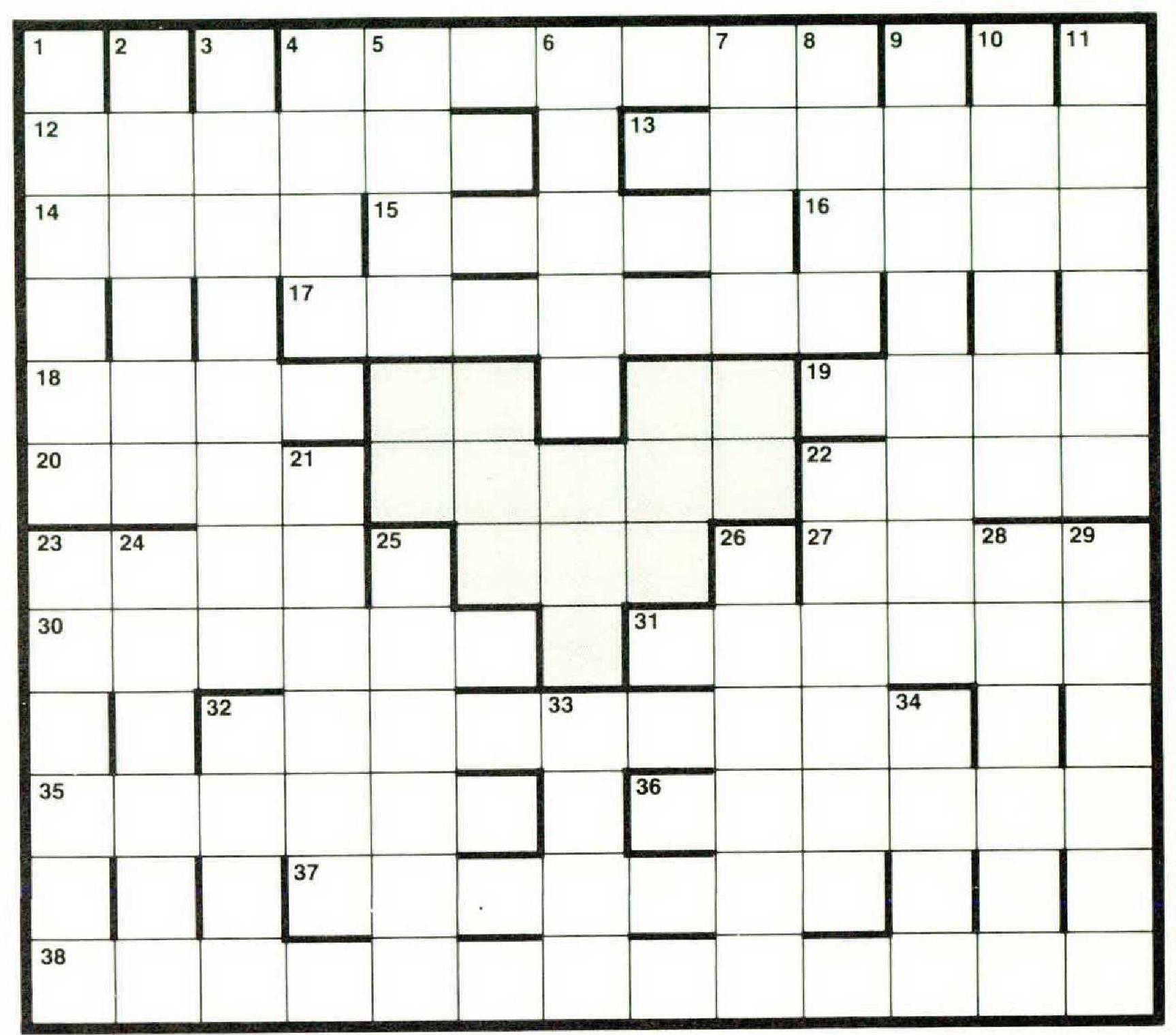 Thirteen of the clue answers give their hearts (i.e., single central letters) to the shaded area in the heart of the diagram. To determine what the heart says, enter these thirteen letters left to right and top to bottom in the order in which their clues are given. The heartless entries that remain and all other clue answers may be entered normally. Answers include nine proper nouns.