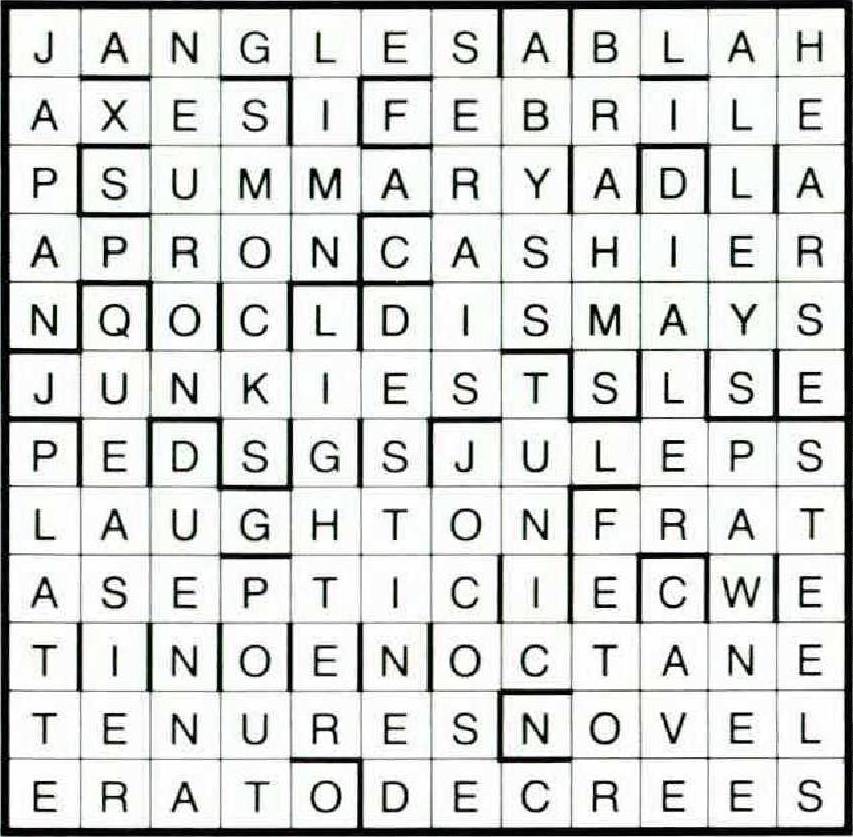 There are six numbered race entrants, each using three clue answers to go around the course from START to FINISH. Each entrant starts in its correspondingly numbered lane, but at each radial line two (and only two) adjacent entrants swap lanes. Racers’ lane positions along the way may be determined with the help of the six-letter words a-q, which are entered radially from inside to outside lanes. The finishing order of the racers (from inside lane to outside) also spells out the winner of this cryptic race. Answers include four proper nouns; all other words may be found in Webster’s Ninth New Collegiate Dictionary.