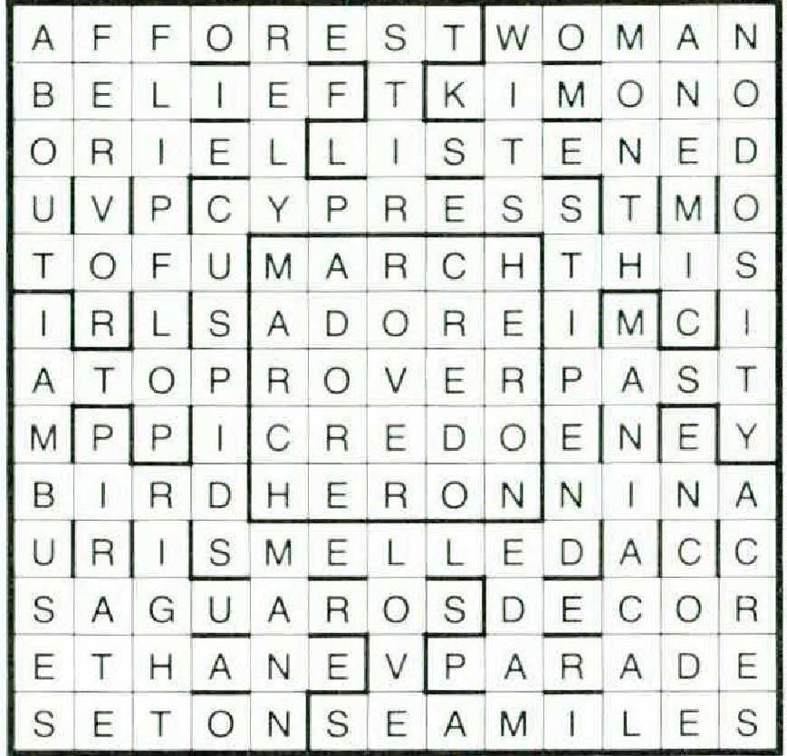 Across. 1. AF(FORES)T 6. WO(MA)N (NOW rev.) 10. BE(LI)EF 11.K(I)MON-O (monk anag.) 12. ORIEL (homoph. of oriole) 13.LI(STENE)D (teens anag.) 14. C-YPRES’s 16. TOFU (hidden) 17. THIS (anag.) 20. A-TO-P 21. PA(S)T 24. BIRD (homoph.) 26. NI-NA (rev.) 28. s(MEL)LED 32. S(AGUA)ROS (Ross anag.) 33. (o)DE-COR(n) 34. E-THANE 35. PAR(AD)E 36. SET ON (rev.) 37. S(EA) MILES Down. 1. AB(O)UT (rev.) 2. F(E-RV)OR 3. F-LIPF-LOP 4. RE(al)LY 5. S(T)IR 6.W(a)ITS 7. MO(N)TH 8. A(NEM)IC (rev.) 9. NODOSITY (anag.) 14. CU(S)PID’S 15.S(TIP)END 18. I-AMBUSES 19. MANIACAL (anag.) 22. PI(RAT)E 23. EN(CO)DE (need anag.) 25. RIGHT (homoph.) 27. A(C)RES 29. MANN (hidden) 30. LOVE (hidden rev.) 31. EDAM (rev.) Word Square. a. ADO-RE b. HER-ON c. CREDO (anag.) d. R-OVER e. MARCH (double def.)