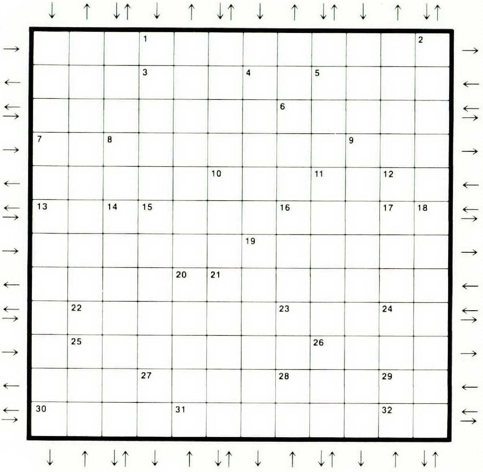 The rows and columns of the diagram represent city streets, with arrows regulating traffic (one-way or two-way). Answers to clues a through gg, entered in the diagram sequentially, trace a tour through the city, starting in the upper lefthand corner and ending in the square just below it. Except for the last one, each answer ends at a Stoplight (in a numbered square), and the next answer begins in the same square. As a guide to constructing the tour, each Stoplight has its letter provided by one of the clues A through E. (These 32 Stoplight squares are numbered left to right and top to bottom for convenience only, and do not indicate the tour’s progression.)
