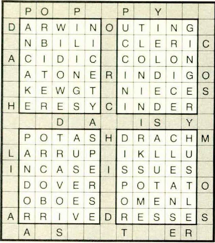 NH. 1. DARWIN (hidden) 2. A(C)ID-IC 3. ATONER 4. HER-ESY (yes anag.) 5. PANC(A-K)E (pecan anag.) 6.OR-BITER 7. W(ID)OWED 8. PI(L-IN)G’S 9. N(ICE-T) NE. l.(r)OUTING 2.CLERIC (anag.) 3.COL-ON 4. IN-DIG-O 5.NIECES (anag.) 6.CI(N)DER 7. p(U)CCINI (anag. + u) 8.YIELDE-D (anag. + d) 9.GIN-GERY (grey anag.) SW. 1. POTASH (anag.) 2.L-A-RR-UP 3.IN CAS-E 4. D-OVER 5.O-BOES (homoph) 6. ARRIVE (rr for / in alive 7.PAND(OR)A 8.TRAV(O)IS 9, A-S-PER-SE SE. 1. DRACH-M (anag. + m) 2. I-SSUES (rev.) 3. POT-AT-O 4. DR-ESSES 5. DIS-PORT (Sid rev.) 6. I(R)KSOME (anag. + r) 7.SA(L)UTES 8. C-LEA(N)SE 9. HUSTLER (anag. minus s)