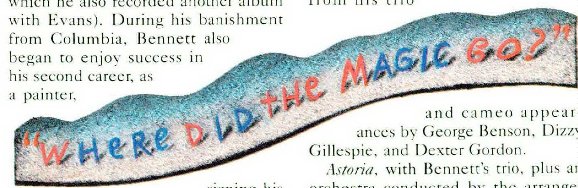 Although Bennett was off the hit parade for good, appealing mostly to listeners beyond the usual record-buying age, he continued to fill nightclubs and concert halls. The confidence that he was going to “make a buck no matter what” seems to have enabled him to renew his relationship with jazz, recording an album of voice-and-piano duets with Bill Evans for Fantasy, and two collections of Rodgers and Hart with the guitarist George Barnes and the eornetist Ruby Bra If for his own label, significantly named Improv (for which he also recorded another album with Evans). During his banishment from Columbia, Bennett also began to enjoy success in his second career, as a painter, signing his works Anthony Benedetto (his real name) and reportedly selling them tor as much as $40,000 each.