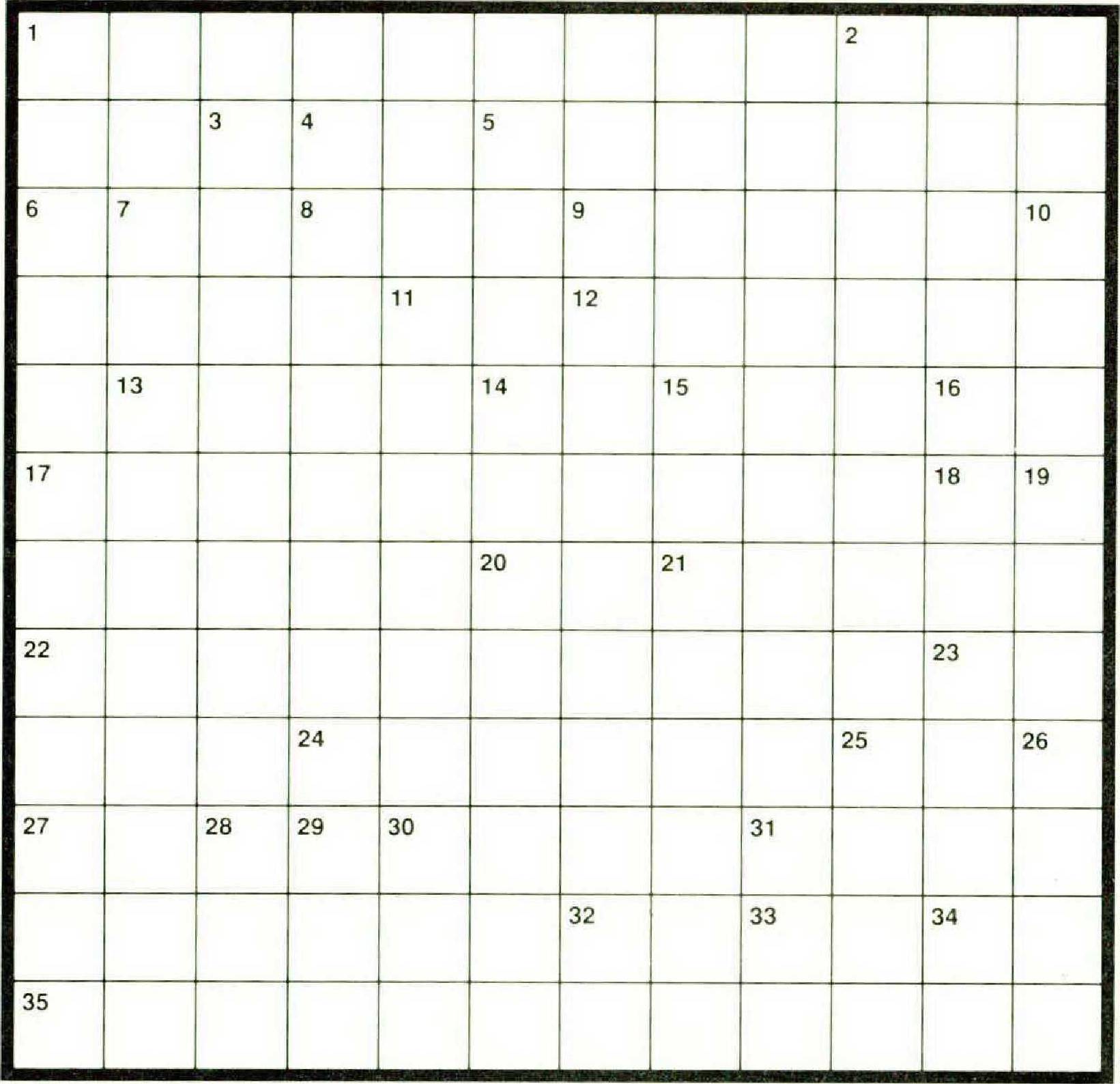 Like the word RECTANGULAR above, each clue answer in this puzzle begins and ends on the same letter, and each is to be entered in the diagram so as to form a rectangle. Starting in its numbered square, an entry may first go left, right, up, or down; the numbered square may or may not be a corner of the rectangle eventually formed by the entry. Answers include three proper nouns.