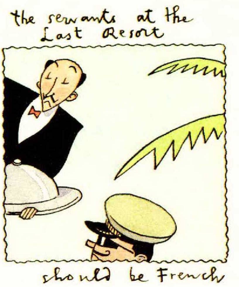 So much for the enticements. It remains to be noted that certain features of life on Socotra— the fine print, as it were—would not be widely publicized. Indeed, many of these features would become apparent only as time unfolded. To begin with, having arrived on Socotra, the former heads of government would never be allowed to leave. (Accompanying staff and family members, on the other hand, would be free to leave, even encouraged to do so— but never permitted to return.) There is also the matter of the help. None of the natives currently living on Socotra can offer quite the right background for employment at The Last Resort, except maybe in the ghee shop, so labor would have to be imported. Because Socotra would be a United Nations operation, it would make sense to award various functions to selected member states. This could be done by bearing in mind the old joke about which nationalities will be doing what in heaven and in hell. The medical-care system, for example, might appropriately be run by the Russians, and the telephone system by the Irish (though the Mexicans could be asked to make the wakeup calls). All the servants at The Resort should be French. Complaints could be handled by bureaucrats seconded from Italian government ministries. The lifeguards would be Mongolian, the sommeliers Iranian, the meter maids from Singapore. Robert J. Lurtsema would control the public-address system.