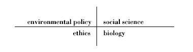 To illustrate the claim just made, think of two intersecting perpendicular lines, and picture the quadrants thus created. Label one quadrant "environmental policy," one "ethics," one "biology," and one "social science."