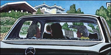 Cristina's car pulled into Elvira's clean, quiet street. All the houses there were tidy, all the high stucco walls freshly painted, all the gates tightly closed. They drove slowly down the block toward Elvira's house. A car, which no one noticed, was parked halfway down the block. At her mother's house Cristina told the driver to pull over to the sidewalk, to let her mother and Consuela out. They didn't go in through the big gates because Cristina was continuing on from there. The two women would get out at the little street door, right next to the sidewalk.