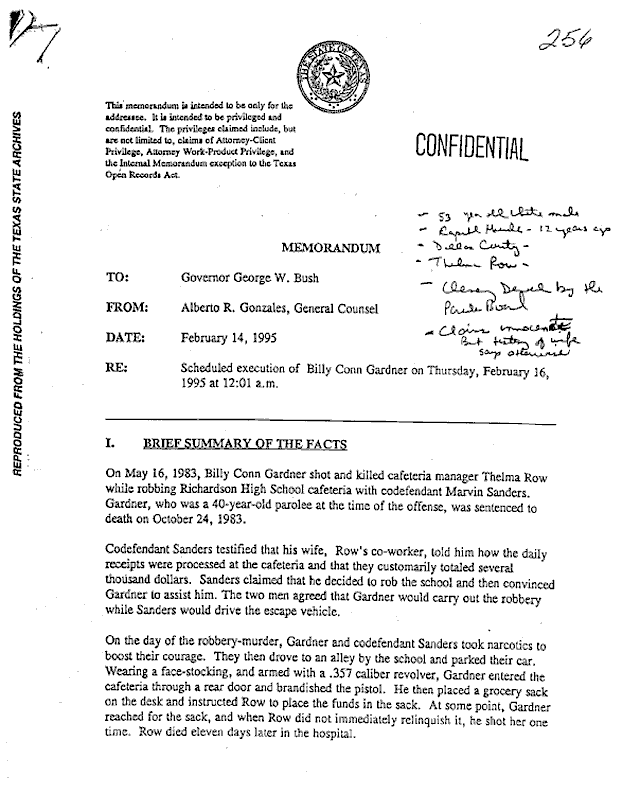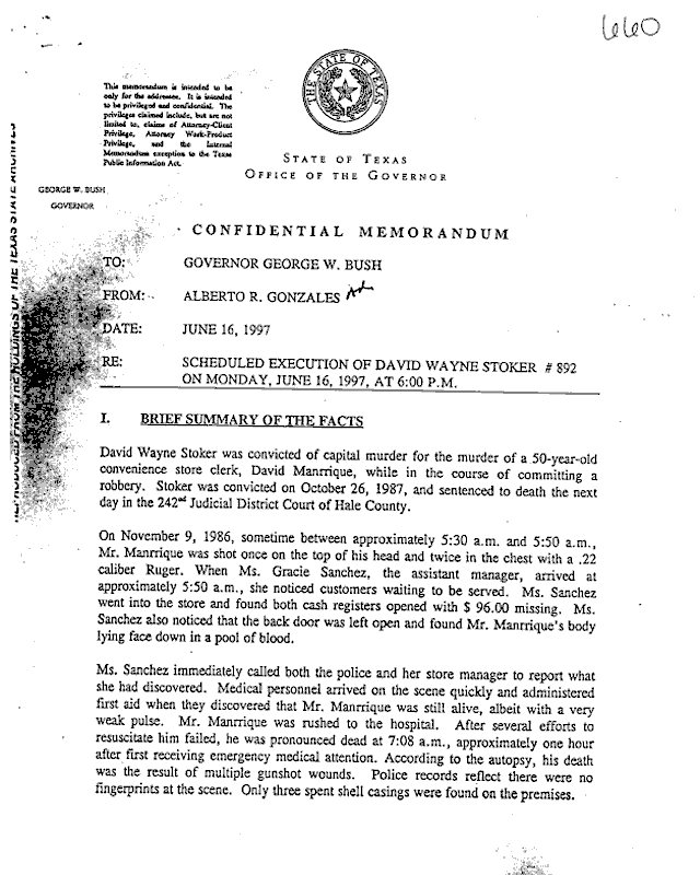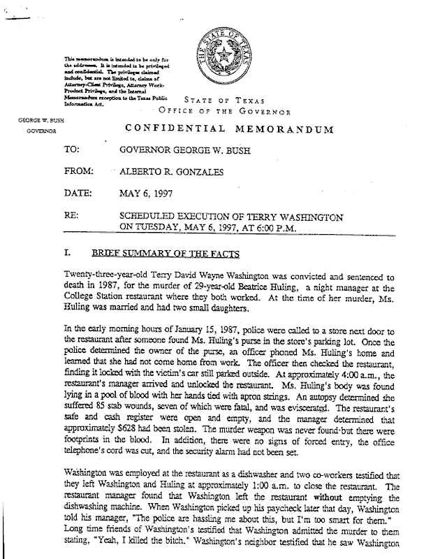 Copies of three death-penalty memoranda prepared by Alberto R. Gonzales for Texas Governor George W. Bush