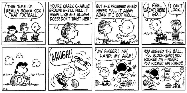 The author gets a detail wrong when she says “the football was always yanked away” from Charlie Brown. Once, in 1979, Lucy did not pull away the football. Of course, Charlie Brown missed and broke Lucy’s arm instead.