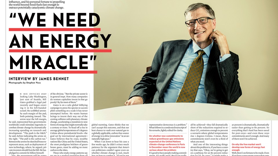 For the November issue, James Bennet interviewed Bill Gates, who has committed his influence and his personal fortune to propelling the world beyond fossil fuels before climate change wreaks cataclysmic damage.