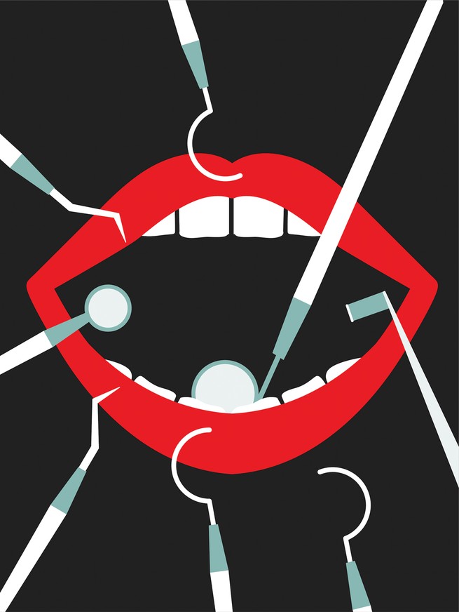 “The Trouble With Dentistry” is a story about abuse of power. Ferris Jabr writes about Dr. John Roger Lund, who allegedly defrauded many of his patients to secure higher profits for himself. This apparent exploitation suggested a wide range of possible imagery: a tooth as a piggy bank; an oil rig inside a mouth; a mountain of removed teeth. I intended for the art to convey a sense of nefarious drama without being too gruesome. I also wanted to capture some of the scarier aspects of even the most routine dental checkup (we’ve all been in that chair, unable to speak as sharp implements descend toward our mouth).