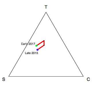 This means that from the beginning of the 2016 primary cycle, I could plot how various interest groups on Reddit corresponded with interest in key candidates on Reddit. In the run-up to the 2018 midterms, my findings reinforce some theories about political coalitions in the 2016 election that would otherwise be difficult to support. In each of the three graphs below, I’ve identified a community of interest—such as a community focused on video games—and plotted how its membership aligns with the membership of subreddits about Donald Trump, Bernie Sanders, and Hillary Clinton. Each corner of the triplot represents a candidate’s subreddit (T for Trump, S for Sanders, and C for Clinton). The closer a point is to a corner, the more similarity there is between the candidate’s subreddit and the community of interest.