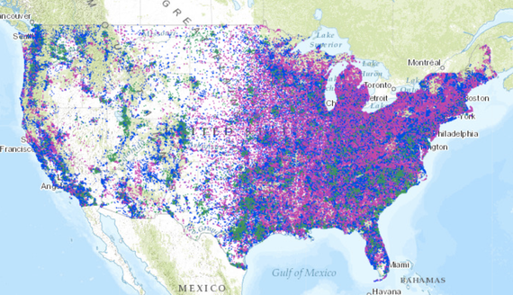 Again, the pinkish dots are counties or neighborhoods that are static or losing population as the whole nation grows, and green is the reverse. If you zoom in on the interactive map at top, you will find a lot of instructive regional patterns, about which we'll have more to say.