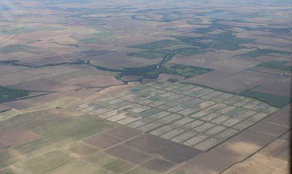 Or at least that is how some of them looked yesterday, from 2500 feet up over the Mississippi Delta. (The triangular white area is window reflection.) For another view, which gives an idea of how strangely brown much of the Delta area looks—this was near Clarksdale, as I remember—at this time of year: