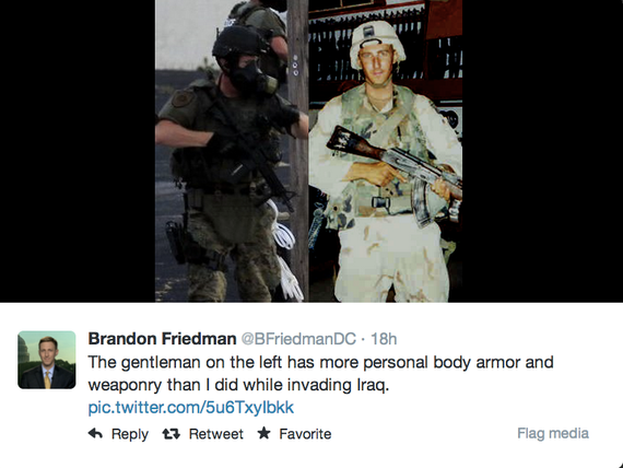 If you haven't yet seen it, please read this Storify account, by Kelsey Atherton, of how veterans of real combat—in Iraq, Afghanistan, and elsewhere—view today's wildly over-militarized American police. For instance: