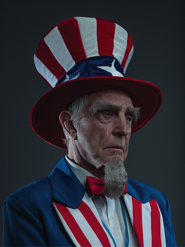 Idea approved, I reached out to the brilliant photographer Phil Toledano to do the shoot. We did a quick casting for our Uncle Sam and the prop stylists went to work on building a partial padded cell, which would be expanded later in post-production. The make-up artist gave our model James Stephens (who is British) a goatee and bushy eyebrows. Once the outfit was on, he was transformed into Uncle Sam: