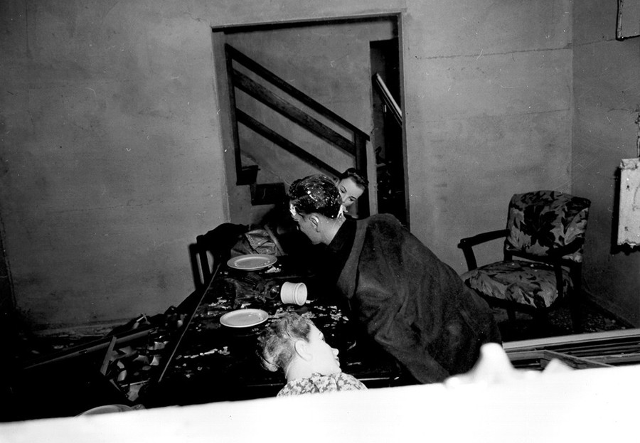 Read more(1 of 2) In Operation Doorstep, conducted during the larger Operation Upshot-Knothole nuclear bomb test, mannequins are seated at a table in the dining room of house number two, attending a "dinner party" thrown by Civil Defense officials who are testing the effects of an atomic explosion on houses and occupants on March 15, 1953. #