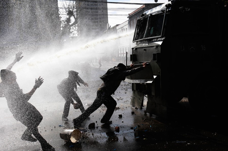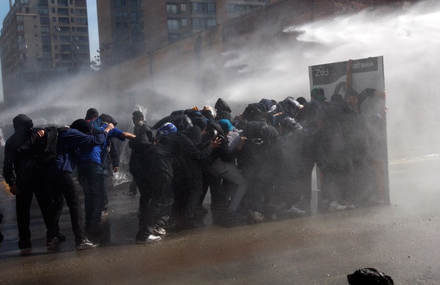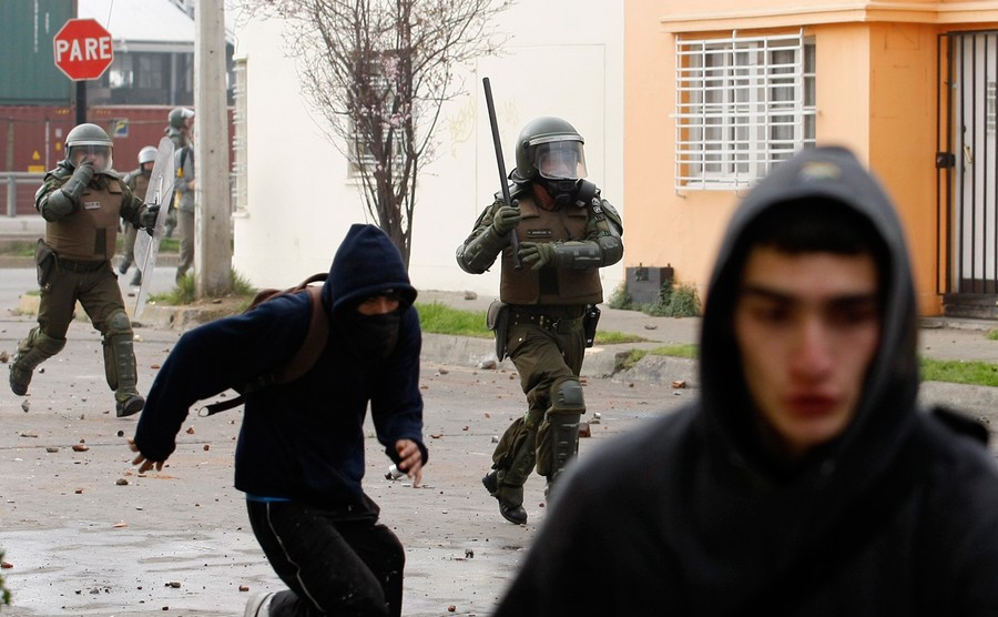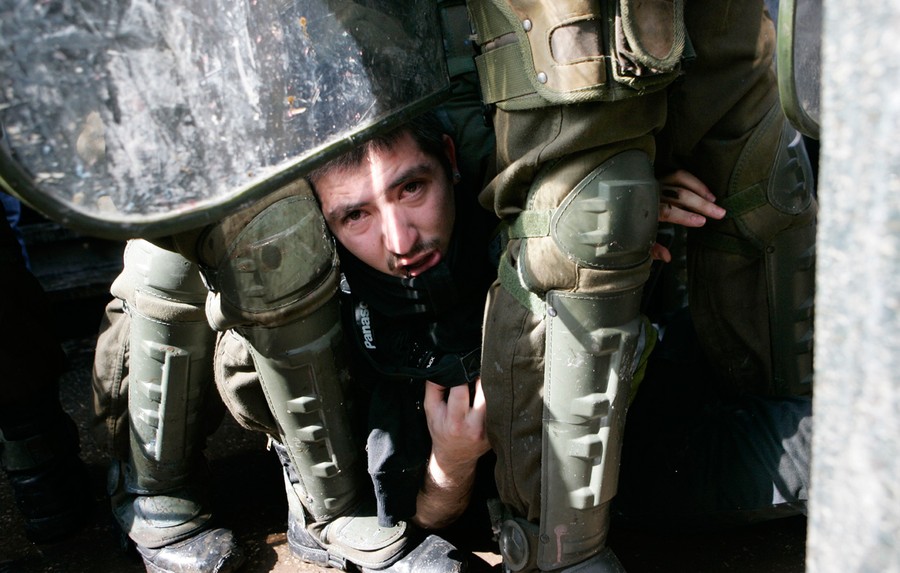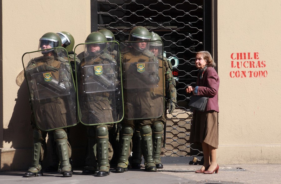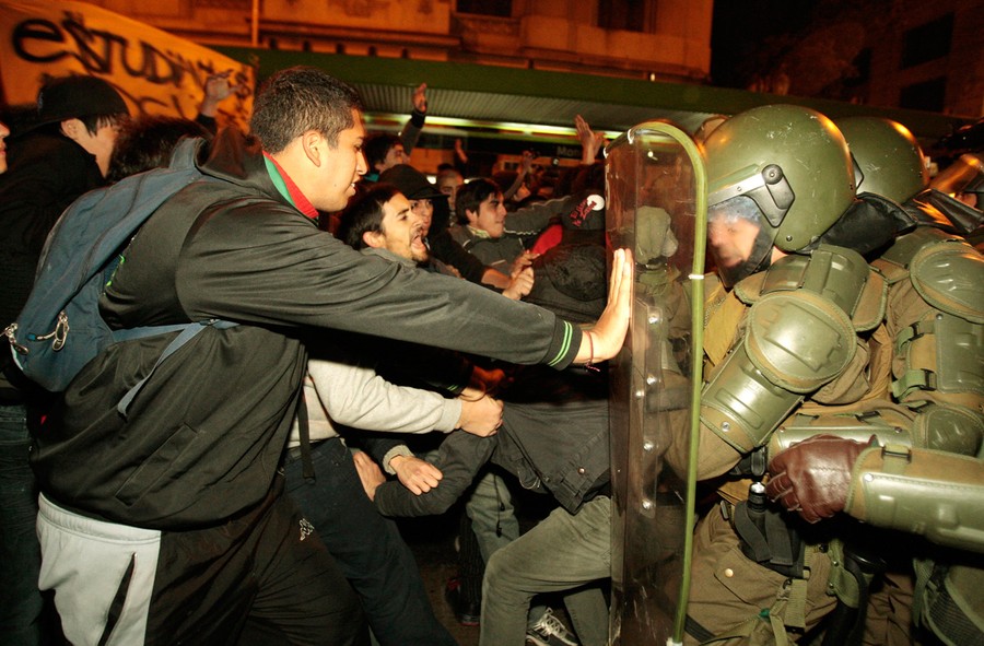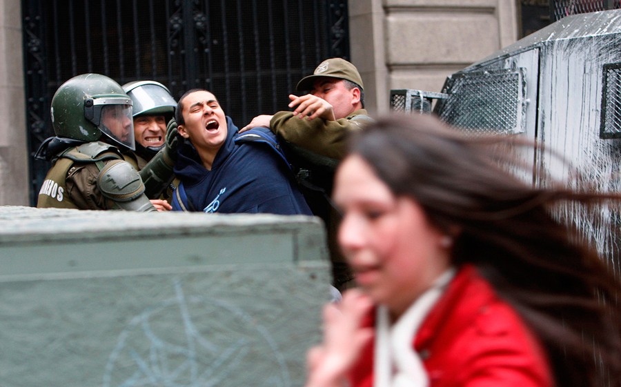 For the past several months, students, teachers, and their supporters in Chile have been staging chaotic demonstrations against their government. Their goal is to transform the country's education system. In particular, they're seeking a referendum to significantly increase the funding and quality of public schools. Students have engaged in multiple forms of protest, from hunger strikes and sit-ins to marches and pillow fights. Smaller groups of protesters have engaged riot police directly, hurling stones and firebombs. Chilean authorities have responded by banning demonstrations, pushing protesters back with water cannons, and offering education proposals that have been rejected. Students in the tens of thousands -- with popular backing across Chile -- continue to march without official permission, and public sentiment against president Sebastian Piñera continues to grow. Collected here are some scenes from the streets of Chile over the past few months.