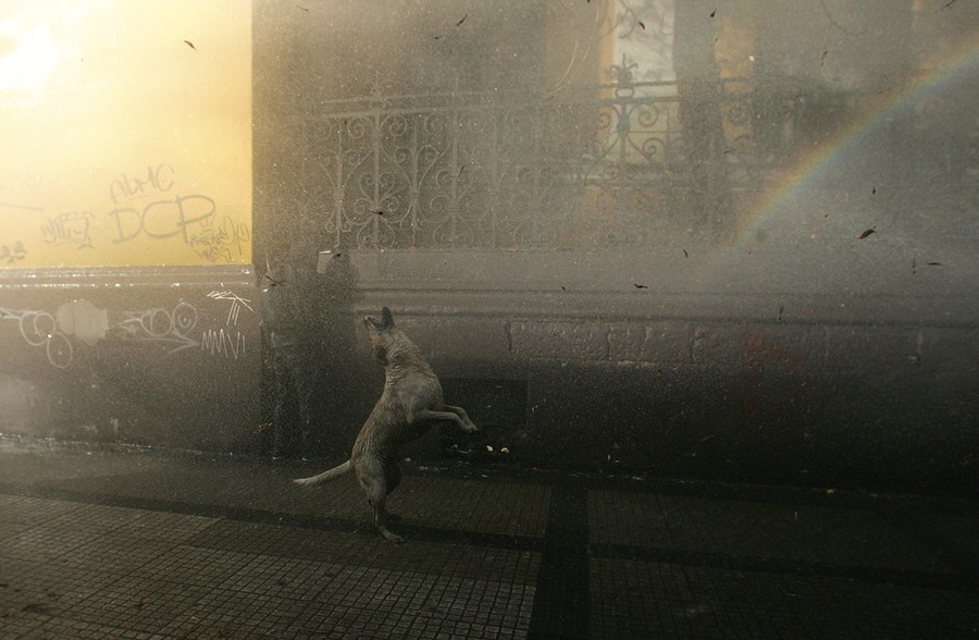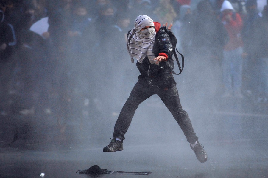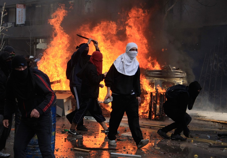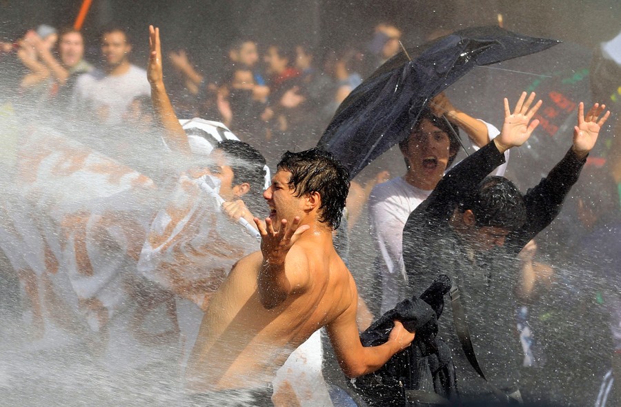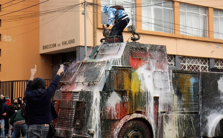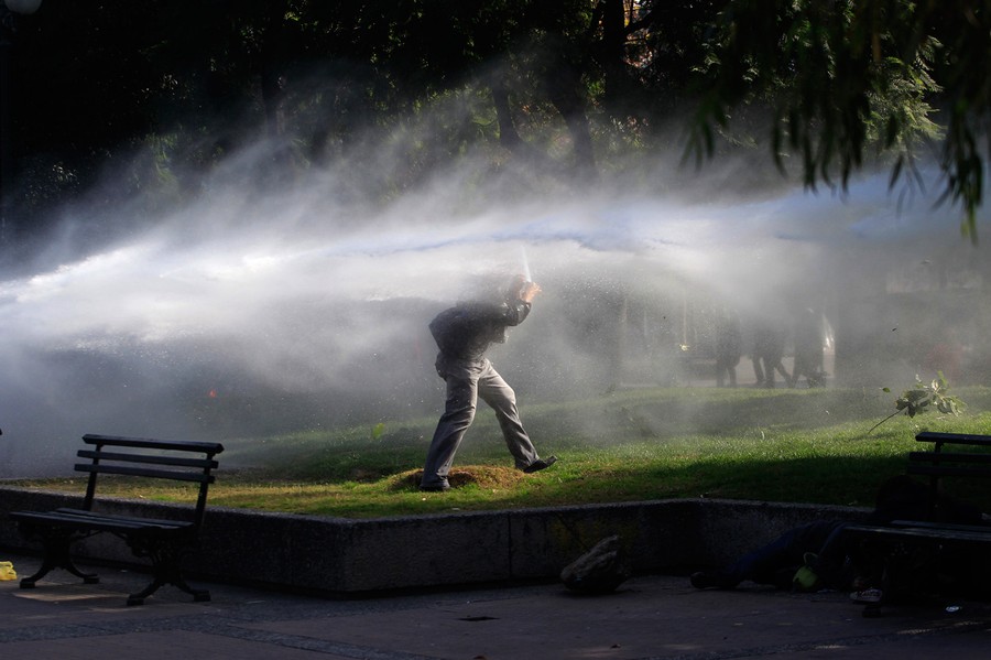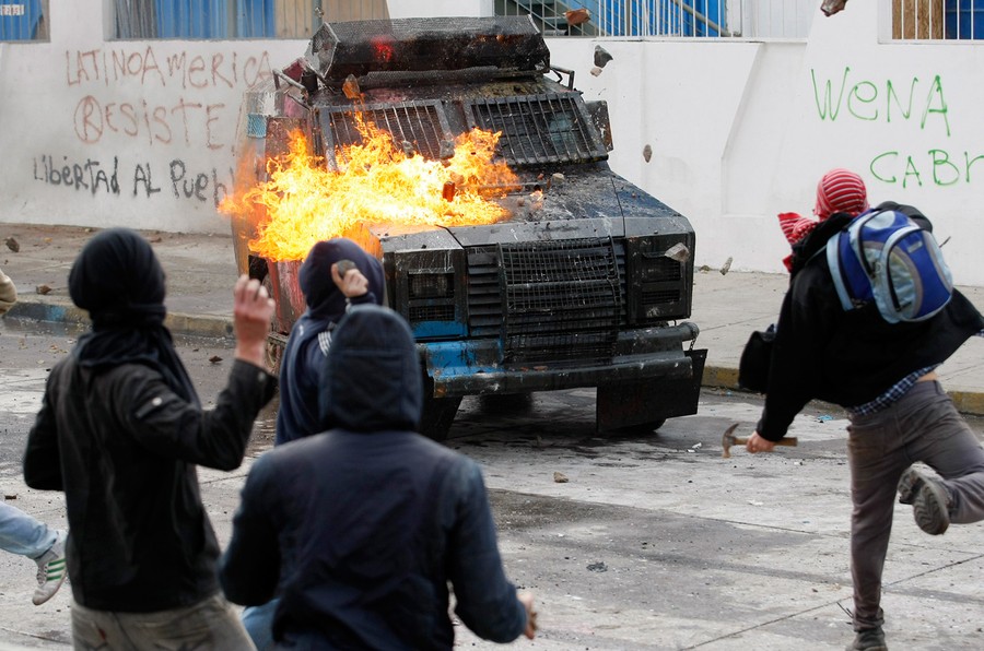 For the past several months, students, teachers, and their supporters in Chile have been staging chaotic demonstrations against their government. Their goal is to transform the country's education system. In particular, they're seeking a referendum to significantly increase the funding and quality of public schools. Students have engaged in multiple forms of protest, from hunger strikes and sit-ins to marches and pillow fights. Smaller groups of protesters have engaged riot police directly, hurling stones and firebombs. Chilean authorities have responded by banning demonstrations, pushing protesters back with water cannons, and offering education proposals that have been rejected. Students in the tens of thousands -- with popular backing across Chile -- continue to march without official permission, and public sentiment against president Sebastian Piñera continues to grow. Collected here are some scenes from the streets of Chile over the past few months.