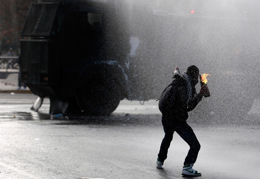 Read moreA demonstrator prepares to throw a homemade bomb as a police water canon shoots water during a demonstration demanding reforms in Chile's educational system in Santiago, Chile, on June 30, 2011. #
