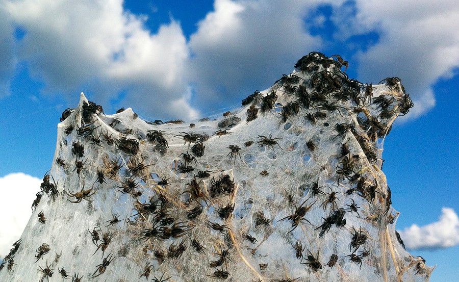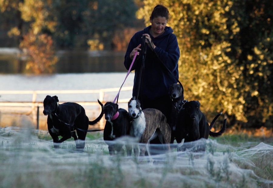 Earlier this month, eastern Australia endured days of torrential rains that flooded large parts of New South Wales, causing an estimated $530 million in damage to homes, bridges, and farms. Covering the flood near the town of Wagga Wagga, Reuters photographer Daniel Munoz came across a large area draped in spider silk. Thousands of spiders were fleeing the rising waters, many of them trailing behind massive amounts of dragline silk. The webs tangled over weeds, trees, fences, and fields, creating a surreal and eerie landscape crawling with arachnids. Residents reportedly complained of being unable to walk in certain areas without swarms of little spiders crawling up their legs, seeking higher ground.