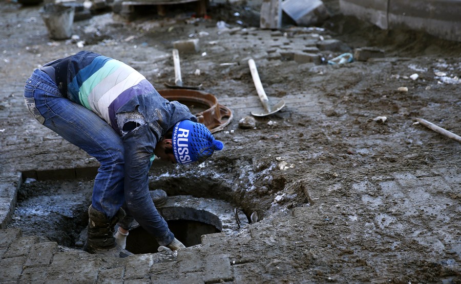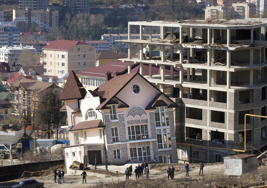 Read moreWorkers cordon off a badly-leaning building in Sochi, on March 3, 2013. A three-story house under construction tilted after a road tunnel being constructed for the 2014 Winter Olympics had collapsed nearby, the local media said. #