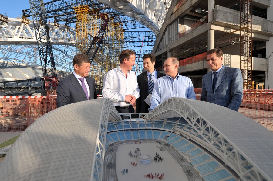 Read more(1 of 4) On May 10, 2013, Russian President Vladimir Putin and Britain's Prime Minister David Cameron visit the Fisht Olympic Stadium where the Opening and Closing Ceremonies of the 2014 Winter Olympics will be held. At right is Deputy Prime Minister Alexander Zhukov, at left is Deputy Prime Minister Dmitry Kozak. #
