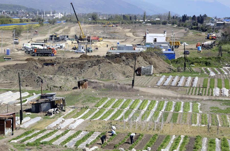 Read more(1 of 4) In this photo from April 25, 2009, people work on their vegetable gardens near the construction site of the Olympic facilities in Sochi. In less than five years, somewhere in this expanse of short grass, stones and weeds by the Black Sea, the 2014 Winter Olympics are to open with a ceremony watched worldwide. In April of 2008, the site was still and silent and the International Olympic Committee's Jean-Claude Killy warned Russia must work "hard and fast" to get Sochi in shape for the games. #