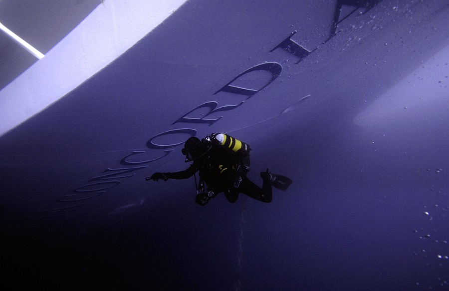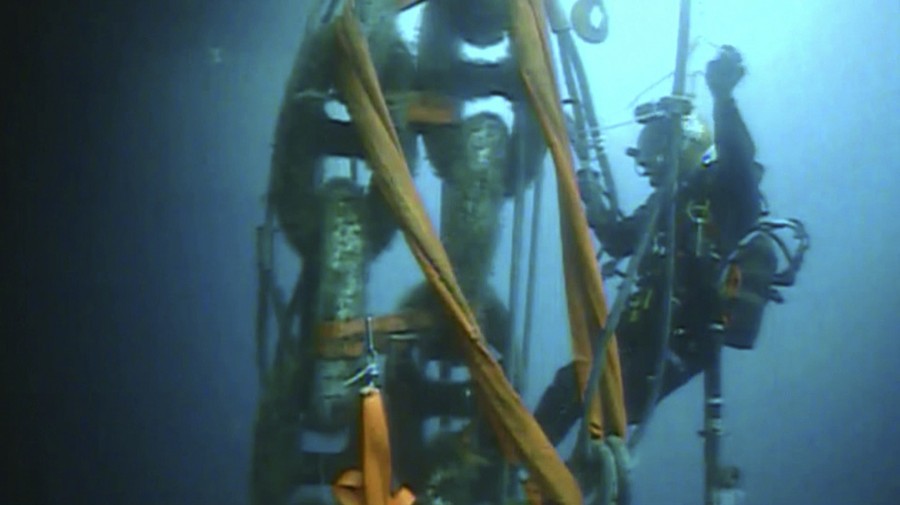 Read moreIn this framegrab made from an underwater video provided by the Costa Concordia wreck removal project information website "The Parbuckling Project", a diver secures one of the 56 chains which fasten huge tanks on the ship's flanks to float it on July 17, 2014. #