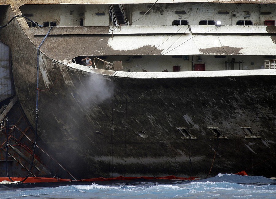 Read moreA worker sprays water on a deck of the Costa Concordia as the vessel is refloated and almost ready to be towed away from the tiny Tuscan island of Isola del Giglio, on July 22, 2014. #