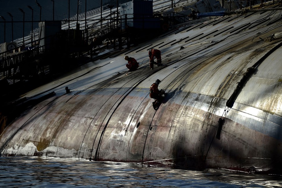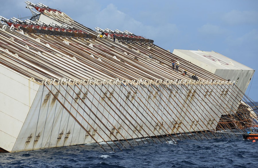 Read moreMembers of the US salvage company Titan and Italian firm Micoperi work at the wreck of Italy's Costa Concordia cruise ship, on September 15, 2013. Salvage workers were preparing to right the ship in the largest and most expensive maritime salvage operation in history, so-called "parbuckling", to rotate the ship by a series of cables and hydraulic machines. #