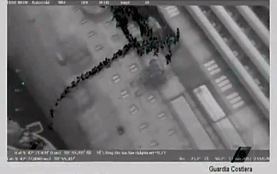 Read moreA still image from video taken January 14, 2012, the night of the crash, shows passengers lined up on the side of the Costa Concordia, as they move down the side of the vessel during an evacuation. #