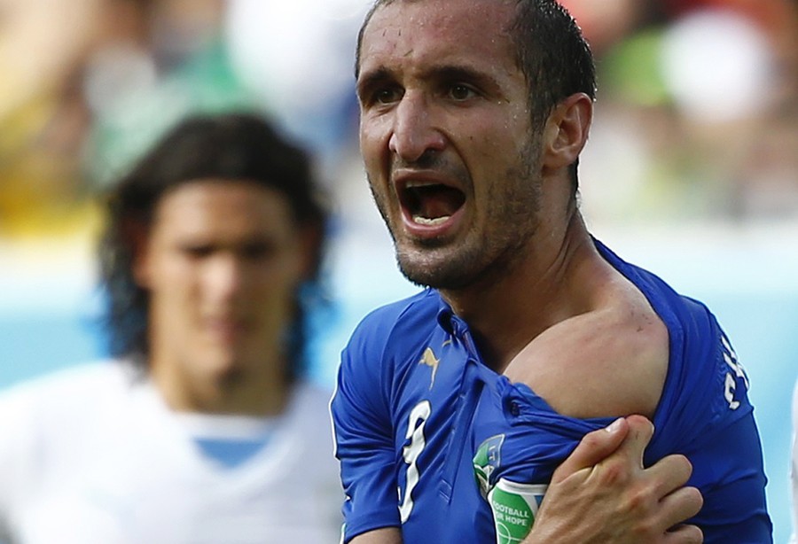 Read moreItaly's Giorgio Chiellini shows his shoulder, claiming he was bitten by Uruguay's Luis Suarez, during their 2014 World Cup Group D soccer match at the Dunas arena in Natal on June 24, 2014. #