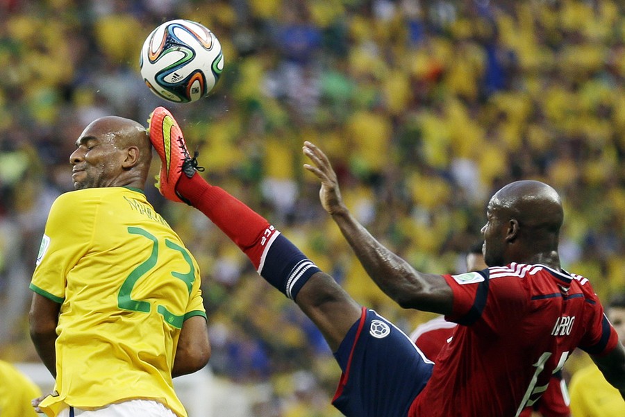 Read moreColombia's Victor Ibarbo clears the ball next to Brazil's Maicon's head during the World Cup quarterfinal soccer match between Brazil and Colombia at the Arena Castelao in Fortaleza, Brazil, on July 4, 2014. #