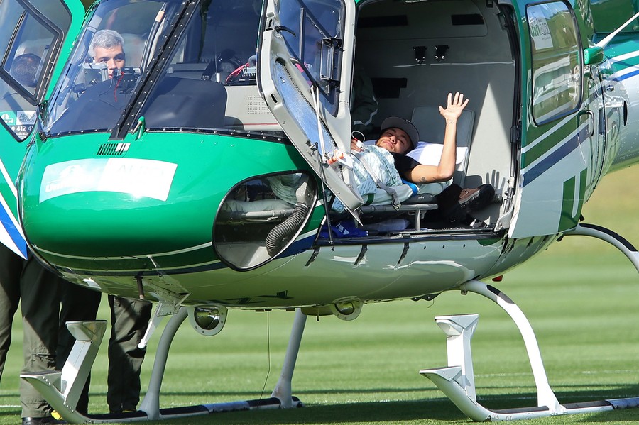 Read moreBrazil's Neymar, inside a medical helicopter at the Granja Comary training center, on July 05, 2014 in Teresopolis, Brazil. Neymar will be treated at home for his back injury. Neymar, the biggest football star in Brazil, was ruled out of the rest of the World Cup after fracturing his third vertebra during Friday's 2-1 quarterfinal win over Colombia. #