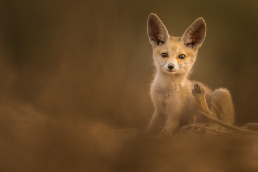 Read moreI found this Arabian Red fox cub outside a den just a side of a small hill. There were 3 cubs with their mom. I got closer and put camouflage netting over me and waited their for two hours straight, then they came out one by one and i started to shoot with my camera. This cub started to clean himself, and I got this picture while he was looking straight at the camera! #