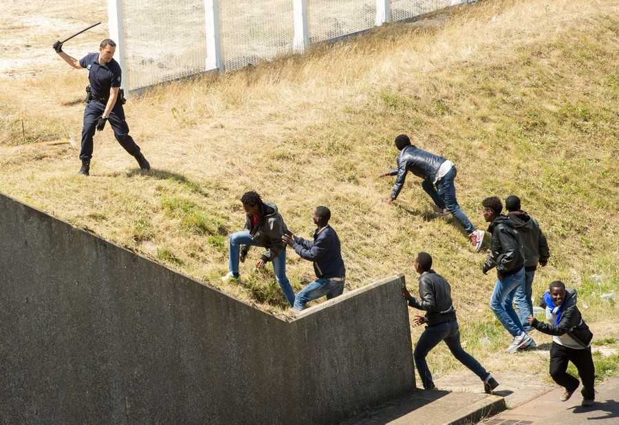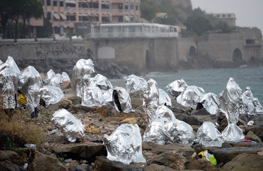 Read moreA group of migrants protect themselves from the weather with emergency blankets as they huddle on the seawall at the Saint Ludovic border crossing on the Mediterranean Sea between Vintimille, Italy and Menton, France, on June 14, 2015. Some 200 migrants, principally from Eritrea and Sudan, who attempted to cross the border on Saturday from Italy, were blocked by Italian police and French gendarmes. #