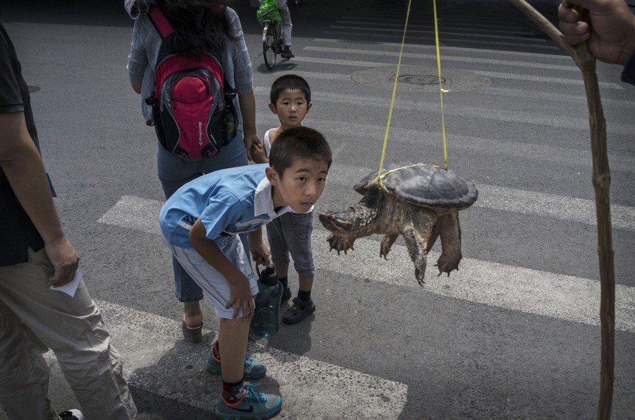 Read moreChinese boys look at a large turtle illegally offered for sale by a vendor (not seen) as they cross a street in Beijing, China. Many Chinese consumers eat turtles as a delicacy and their parts are often sought after for use in traditional Chinese medicines. #