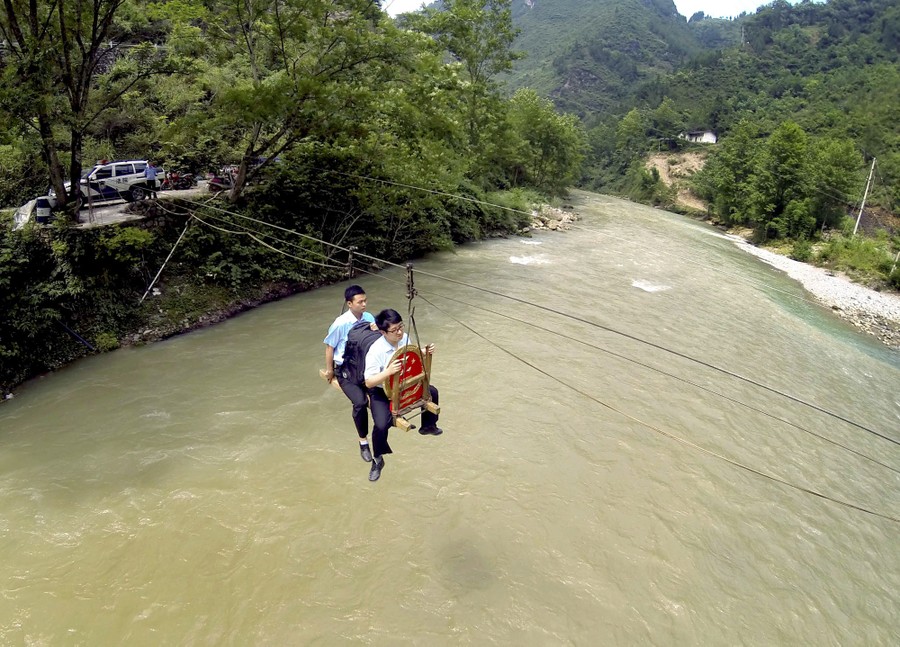 Read moreCourt officers hold a national emblem as they ride a zip-line across a river, to attend a mobile court hearing of a divorce dispute, in Huilong village of Fengjie county, China, on June 9, 2015. #