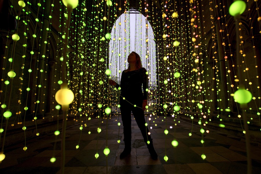 Read moreRoz Mitchell, marketing manager, explores the new Squidsoup light installation, Enlightenment, in the North Porch of Salisbury Cathedral on June 12, 2015, in Salisbury, England. The installation, which is made up of around 6,000 points of color-changing light bulbs suspended from the ceiling, is part of the Cathedral's celebrations for the 800th anniversary of the Magna Carta. #
