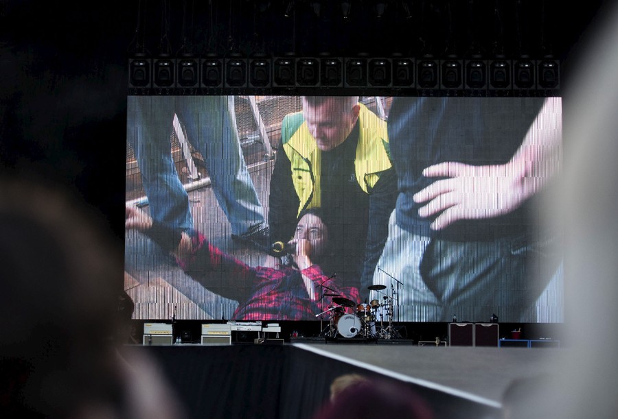 Read moreFoo Fighters band member Dave Grohl is seen on a big screen speaking on a microphone after falling from the stage during the band's concert at Nya Ullevi in Gothenburg, Sweden, on June 12, 2015. Grohl broke his leg in the fall, but returned to the stage after medical attention and completed the set while seated, his leg elevated, as a medic monitored his injury. #