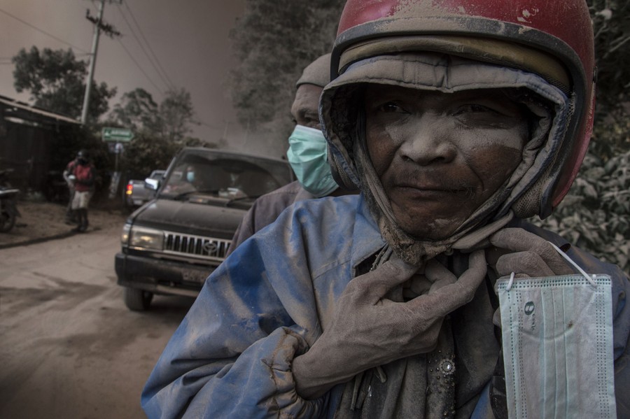 Read moreThe faces of a motorcyclist and a pillion rider are seen covered by ash spewed by the Mount Sinabung volcano as he rides his vehicle in Karo district, North Sumatra province, on June 13, 2015. #