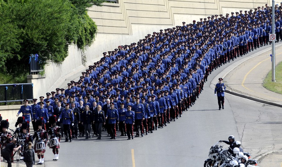 Read moreMembers of the Edmonton Police Service follow the hearse carrying the coffin of slain Edmonton Police officer, Constable Daniel Woodall, during the Regimental Funeral Procession in Edmonton on June 17, 2015. #