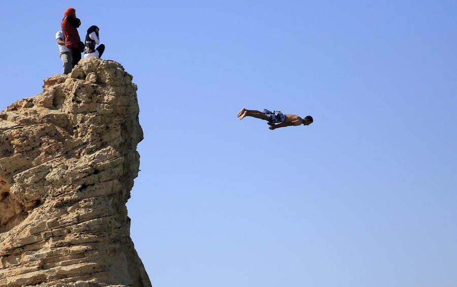 Read moreVisitors react as a man jumps into the water above Cleopatra's Beach, on a summer’s day before the start of the holy month of Ramadan, which begins on June 18, at the Mediterranean city of Marsa Matrouh, northwest of Cairo, Egypt, on June 16, 2015. #
