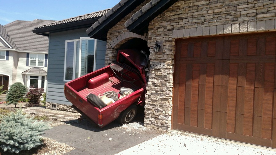 Read moreIn this Monday, June 15, 2015, photo, a pickup truck remains on the scene after it crashed into a home in Camas, Washington. Ann Degenshein said she opened her window and saw a pickup truck sticking out of her front entrance. #