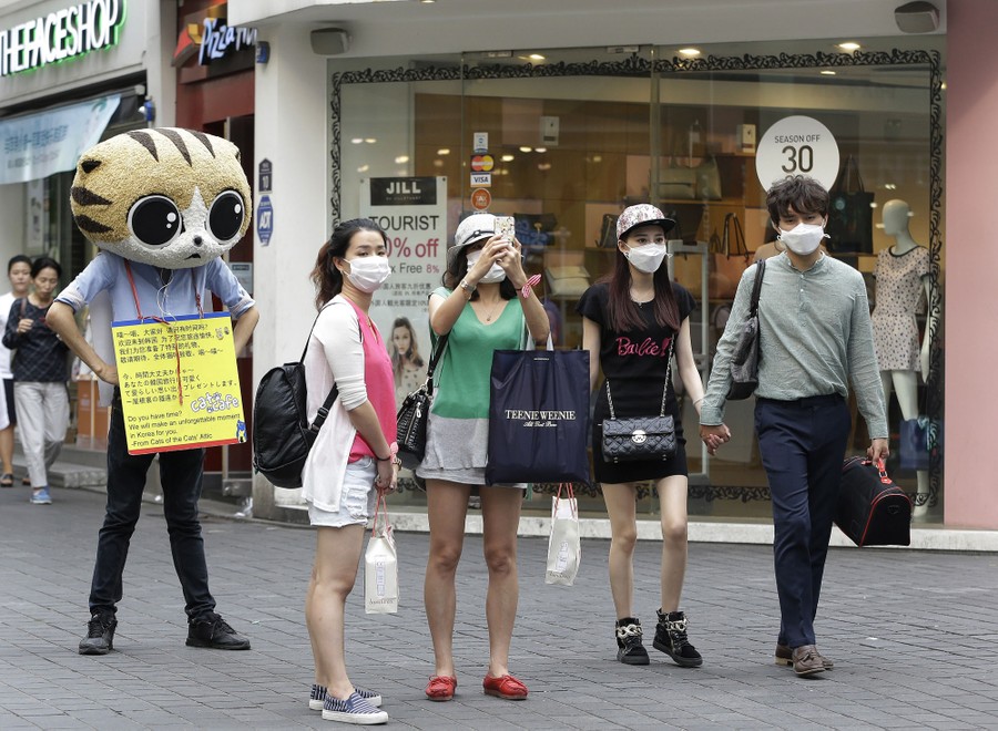 Read morePeople wear masks as a precaution against the Middle East Respiratory Syndrome (MERS) virus as they walk in Myeongdong, one of Seoul's main shopping districts, on June 15, 2015. #