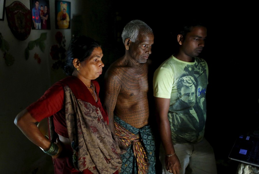 Read moreMahettar Ram Tandon (center), 76, watches a religious movie on a computer with his wife and son inside his house in the village of Jamgahan, on November 17, 2015. “It was my new birth the day I started having the tattoos,” Tandon said. “The old me had died.” #
