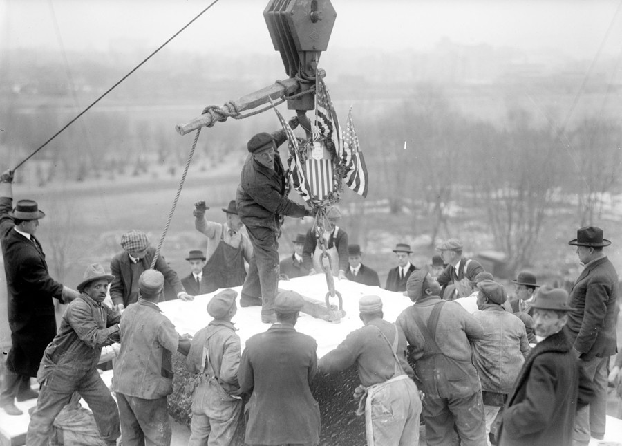 Read moreThe 36 columns in place, work is underway on the frieze, where the names of the 36 states in the Union at the time of Lincoln's death are inscribed, photographed in 1915. #
