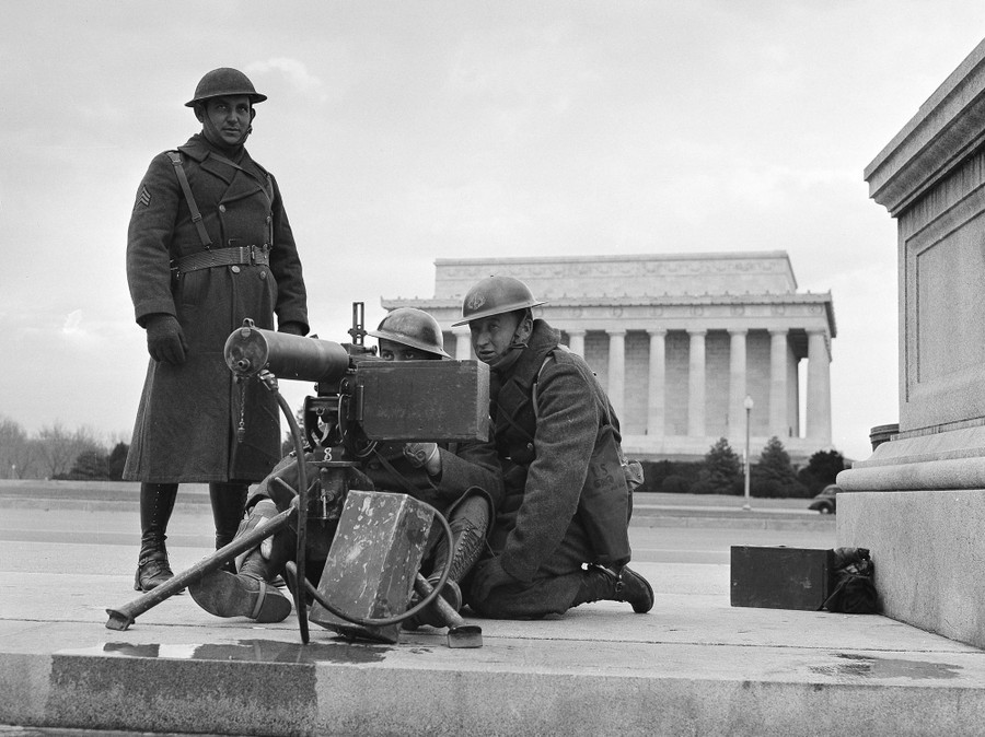 Read moreSoldiers with a machine gun set up near the Lincoln Memorial to guard the Memorial Bridge approach to Washington, D.C., on December 8, 1941. The added security was a precautionary measure taken in the wake of the Japanese attack on Pearl Harbor the previous day. #